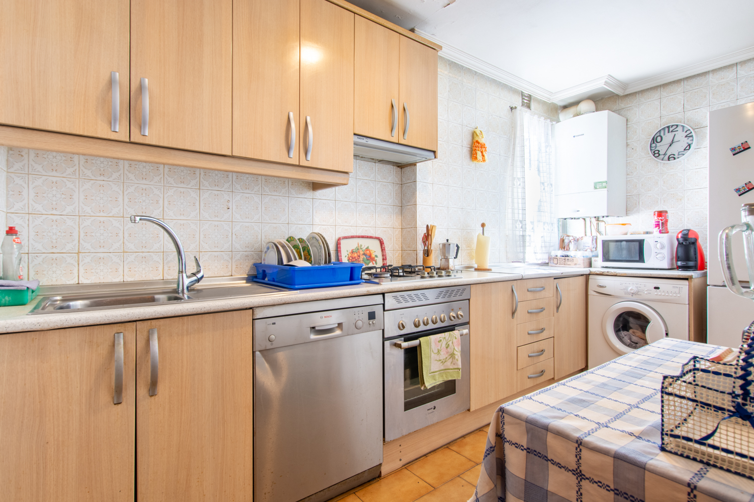 La cocina, equipada con muebles altos y bajos, es ideal para los amantes de la gastronomía. Además, cuenta con un práctico trastero o despensa en la entrada, perfecto para mantener el orden en casa.